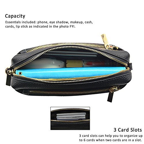 3.WALLET: total 3 pockets design, Inside: A large full length center pocket with 3 card slots and a small zippered pocket, which can hold keys, phone, money, coins, credit cards, ID, lipstick, tissue, eyeliner, perfume roller. Outside: Two side zippered pouches can hold phone up to 4.8", such as naked iPhone 7/6s/6 or with a slim case, and some small items for you quick access.