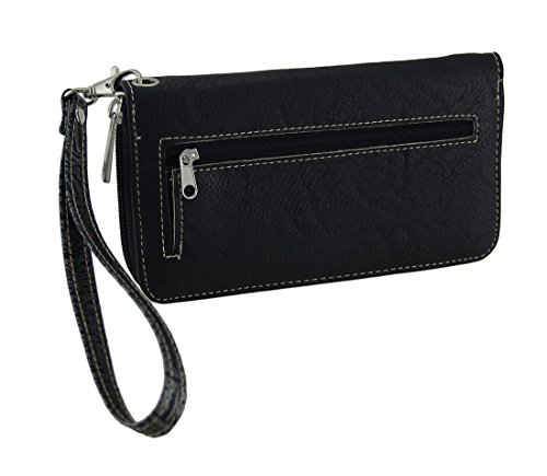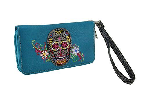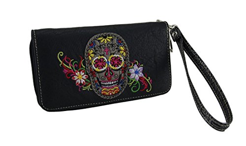 Studio : Zeckos Publisher : Zeckos Product Description Featuring a colorful embroidered sugar skull with embroidered floral accents, the only thing missing from this wallet is you! This 7.5 inch long, 4 inch high, 1 inch wide (19 X 10 X 3 cm) textured vinyl wallet keeps you organized with 12 card slots, 3 slip pockets and 1 zippered change pouch inside and an expandable zip pocket on the back. It includes a removable wrist strap for when you don't want to carry a purse, and it secures with a wrap around zipper. 0