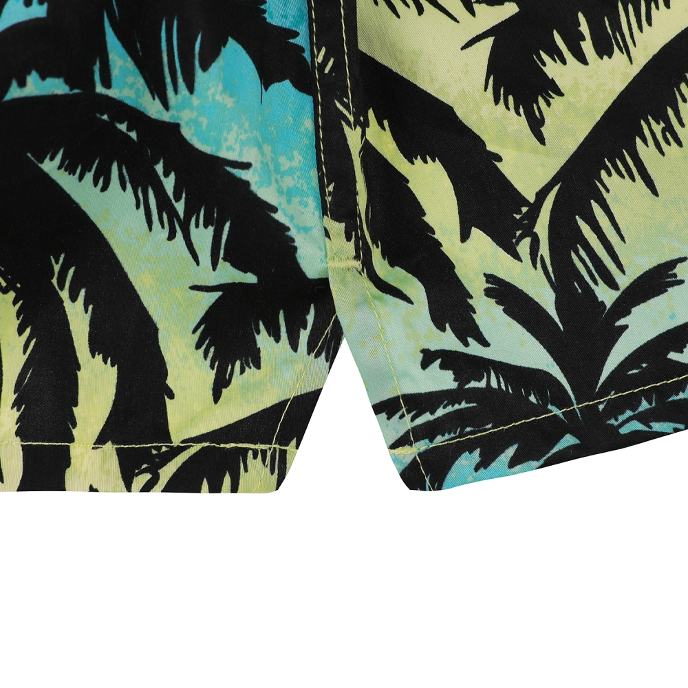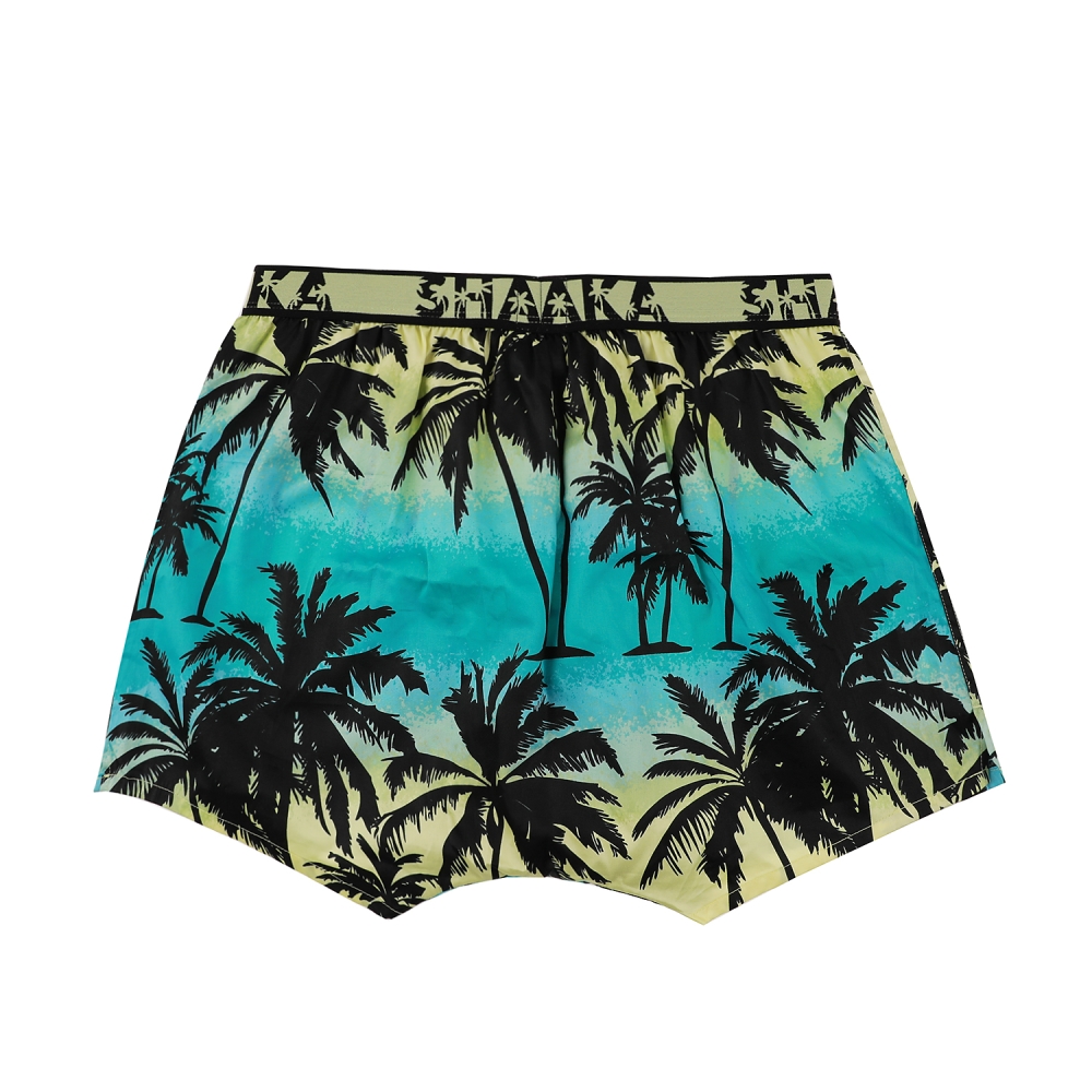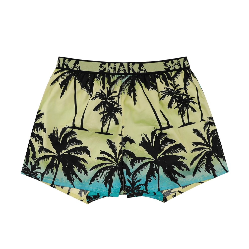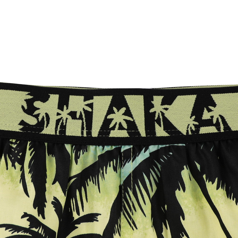 필터를 덧씌운 듯한 청량감 있는 야자수 프린트와 서퍼들의 인사말인 SHAKA로고 아웃밴드를 매치한 디자인.