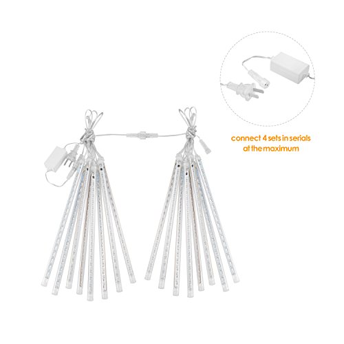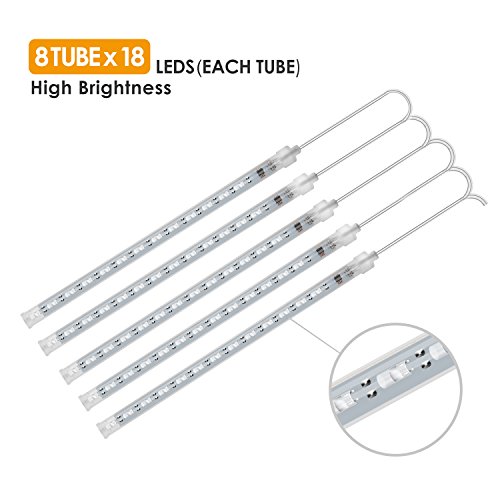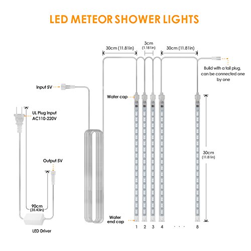 Features: This outdoor string lights could Widely used in garden, pedestrian street, park, Christmas tree, etc. Special-effect just likes meteor shower or falling rain in the night sky Waterproof function allows you to use it even if in rainy days Acrylic material, safe, durable and reliable Constant current design, great brightness and low energy consumption One set includes 8pcs tube light