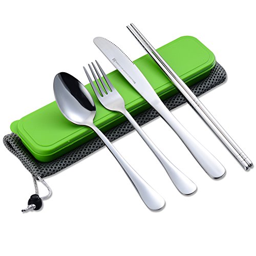 4 Pieces Flatware Stainless Steel Flatware Set Chopstick Spoon Fork knife Travel Camping Outdoor Office Portable with Case and Net Bag