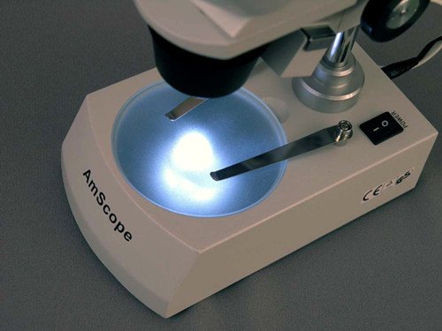 - Frosted stage plate allows light to pass through from below with transparent specimens, reversible black and white stage plate provides contrast with light- and dark-colored specimens, and stage clips secure the specimen during viewing
