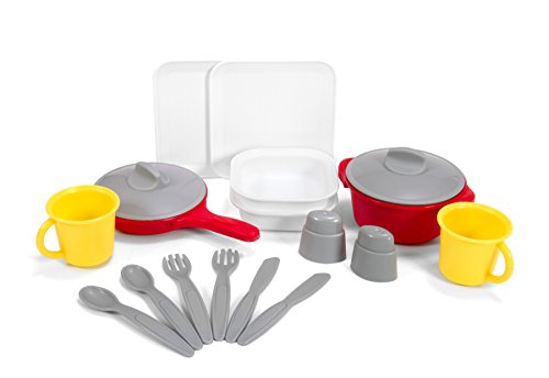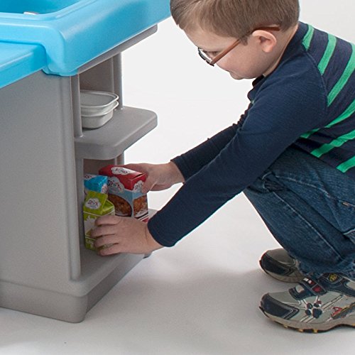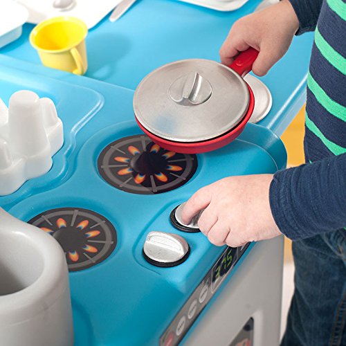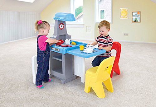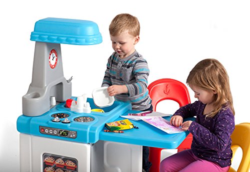 Toddlers love this all-in-one play kitchen and activity center. Your child is the chef and imagination is the key ingredient! This space saving, 3-sided children's toy kitchen set offers plenty of fun for up to five boys and girls. Extend the drop leaf table for pretend dining or activity play. A play oven, stove, sink with faucet, cupboard shelves, and an 18 piece cooking and dining play set with pots, pans, and utensils complete the culinary play experience! Simplay3 Play Around Chairs are sold separately.Feature