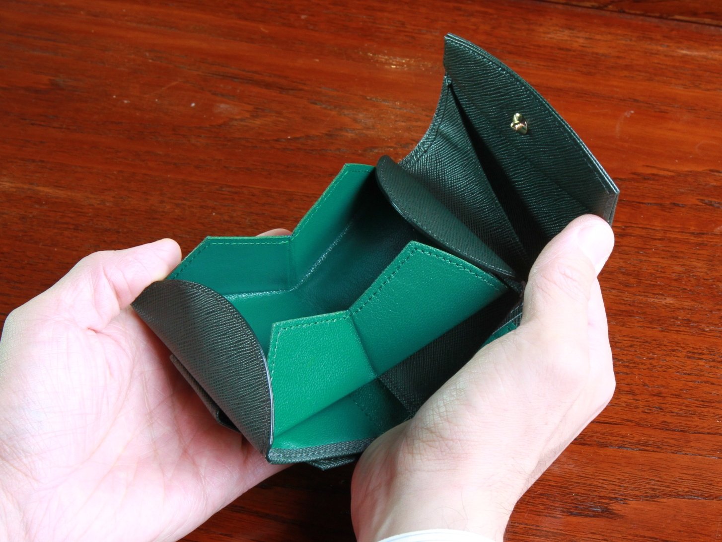 For the men's hammock wallet compact, the "hammock structure" which is the feature of this product, the area of the bottom has doubled by opening the main body and the coin storage portion rises, the bottom area is doubled, the visibility of the coin is raised