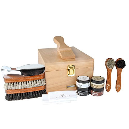 Product Description The FootFitter Valet Set with FootFitter Shoe Cream is the essential kit for any shoe care fanatic. This set gives (1) FootFitter Wooden Shoe Shine Valet packed with all the tools needed for the perfect shine. (2) FootFitter Regular Shoe Shine Brushes and (2) FootFitter Shoe Shine Daubers will keep shoes clean and distribute polish evenly. Their wooden handles are contoured for a better grip while genuine horsehair bristles are effective, yet gentle. When ready for polishing, (4) jars of FootFitter Shoe Cream will revitalize and restore color to your brown, black, neutral, or white colored shoes. (2) FootFitter Microfiber Shoe Shine Cloths will stretch as needed to provide a desired shine. To help get those shining shoes back on your feet, the 7" stainless steel shoe horn will protect the bending of your shoes structured back. The spacious inside of the Valet will hold the tools when not in use. 0
