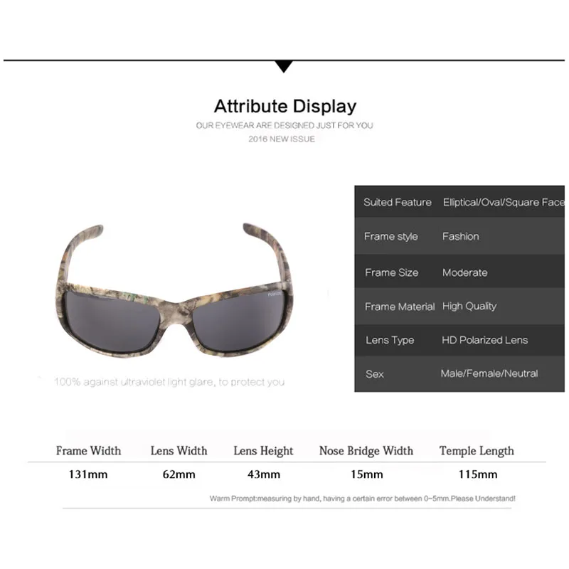 Frame Material: High-end Plastic,Camo Style Lens Material: HD Polarized Usage Scope: Traveling,Fishing,Driving,Cycling,Outdoor Sport Package: Cloth Bag,Polarized Test Card,Hard Case Suitable Face: Round Face Long Face Square Face Oval Shape Face