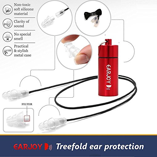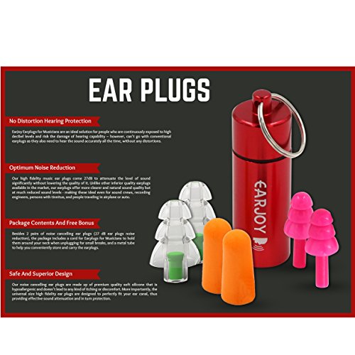 - Attenuates sound without affecting the quality of it - which means you can still hear accurately but at a much lower and safer level - Ideal for musicians, those attending concerts, sound engineers, bike riders, those working near loud mechanical machinery, or even for those traveling in airplane - (27 dB ear plugs noise reduction) - Use the one that best serves your purpose - 27dB provides high protection noise cancelling ear plugs - Made up of superior grade silicone that's hypoallergenic and feels soft and comfortable - Includes a cord for high fidelity ear plugs to hold them when you take them off for short durations - Includes a premium quality metal tube for ease of storage and portability - FREE BONUS - you also get Free Sleeping and Swimming high fidelity ear plugs to equip you with a complete ear protection kit