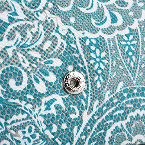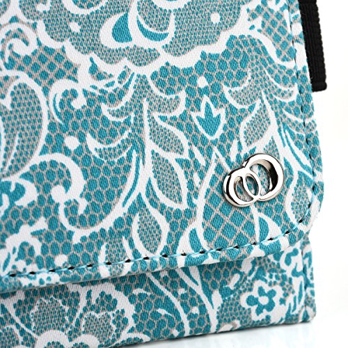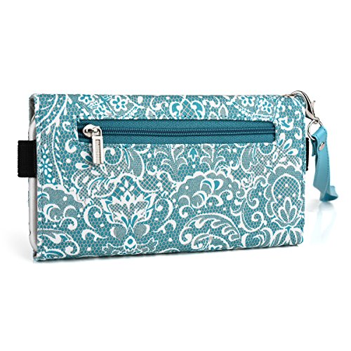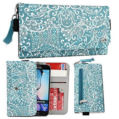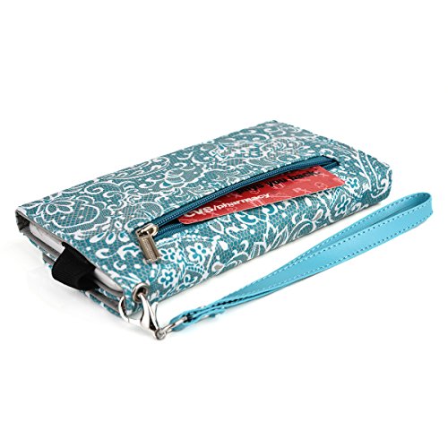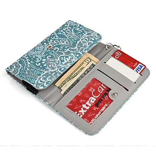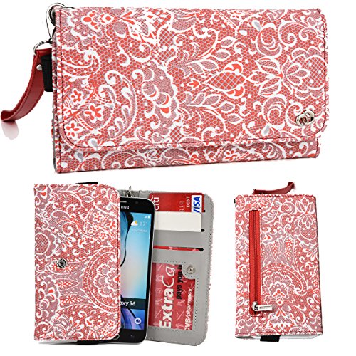 Product descriptions: Lace print fabric upper in a wallet smart phone wristlet. Features snap button closure, ID and card slots, phone compartment (see dimensions), faux leather lining. Removable wrist strap.