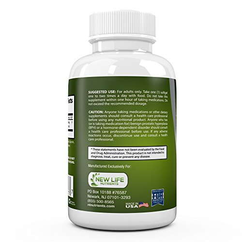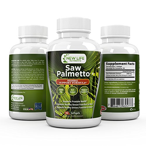 -. Binding : Health and Beauty -. Brand : New Life Nutrients -. Feature : Supports Prostate, Hair Growth, and Urinary System Health / High Potency 1000 mg Single Softgel Daily Dose / 100% Natural, Herbal, Vegan, and Made in the USA / Manufactured in an FDA Approved Facility with the Highest GMP Standards / 3rd Party Tested by Lot Number Before Even Being Encapsulated -. IsAdultProduct : 0 -. Label : New Life Nutrients -. Manufacturer : New Life Nutrients -. PackageQuantity : 1 -. ProductGroup : Health and Beauty -. ProductTypeName : HEALTH_PERSONAL_CARE -. Publisher : New Life Nutrients -. Size : 90 Count -. Studio : New Life Nutrients -. Title : Saw Palmetto - Extra Strength - 1000 mg Berry Extract - Easy Single Daily Dosage - #1 Herbal Supplement for Prostate Support - Nature Made Alternative for Men's Vital Health - Benign Prostatic Hyperplasia (BPH) Support - Made In USA - FDA Quality Inspected - 100% Guarantee