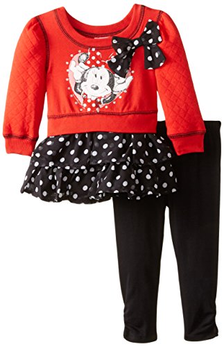 -. Binding : Apparel -. Brand : Disney -. Department : baby-girls -. Feature : Two-piece set featuring top with glittered Minnie Mouse screen print and coordinating legging / Top features quilted sleeves, bow applique, and tiered-ruffle skirt / Legging features elastic waistband and slight ruching at hem -. Label : Disney Baby -. Manufacturer : Disney Baby -. PackageQuantity : 1 -. ProductGroup : Apparel -. ProductTypeName : SHIRT -. Publisher : Disney Baby -. Studio : Disney Baby -. Title : Disney Baby Girls' Minnie Ruffled Top with Bow and Legging Two-Piece Set