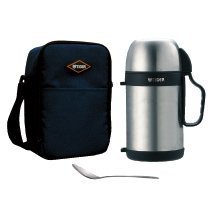 Tiger 0.9 Liter Vacuum Insulated thermal food container. Triple walled vacuum insulation, two stainless steel layers with a copper inner lining keeps soups or other meals hot for an extended time. The lid conveniently serves as a bowl and with the included spoon, you can have your meal anytime, anywhere. Another small container is included to hold croutons, crackers or anything else you would like to eat with your meal. The steel is 304 grade. It is all stainless steel inside with no Teflon or other coating.