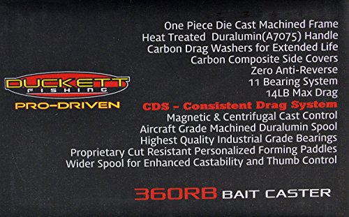 -. Feature : One Piece Die Cast Machined Frame / Zero Anti-Reverse / 11 Bearing System / 14LB Max Drag / Includes a Duckett Fishing Adjustable Baseball Cap