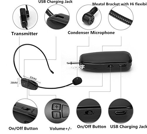 ♥Headset and handhold 2 in 1: remove the head bracket, hold the transmitter in hand, it will becomes a handhold microphone.2 in 1 USB Charging Cable. It can charge for headset microphone and signal receiver at the same time. Save half your time.