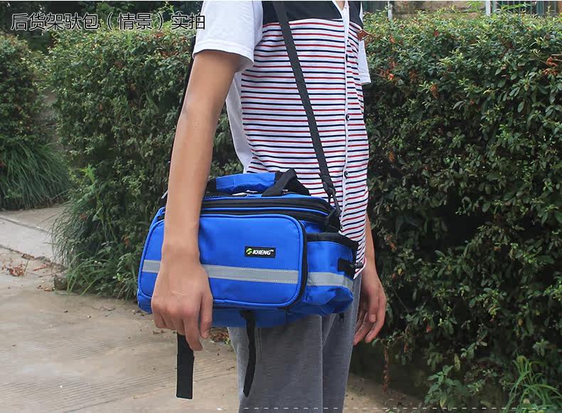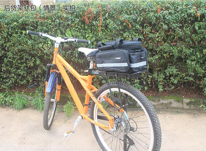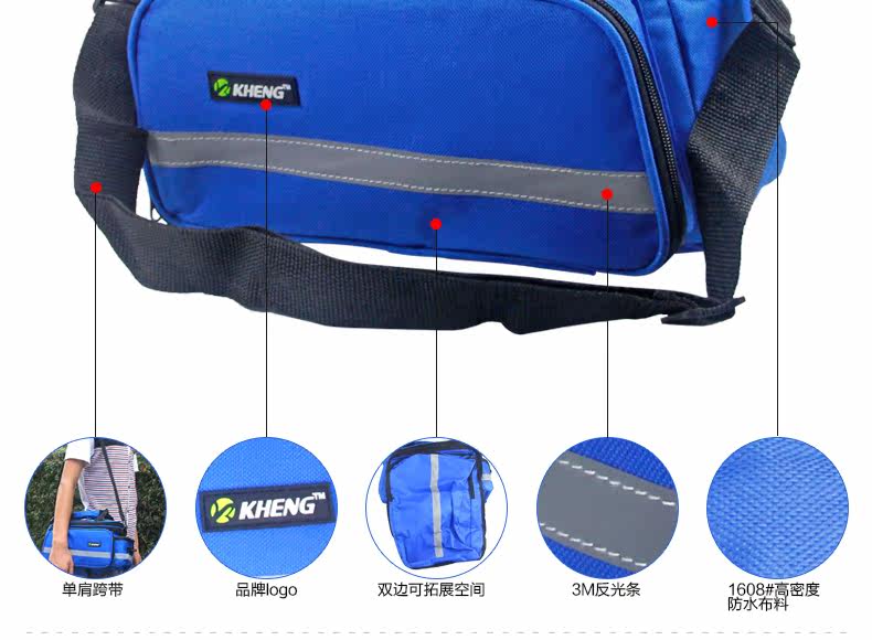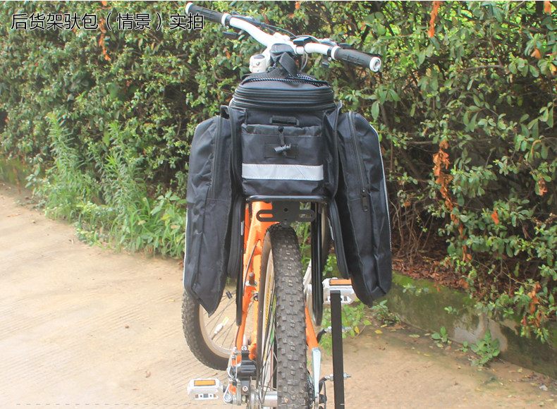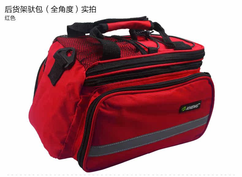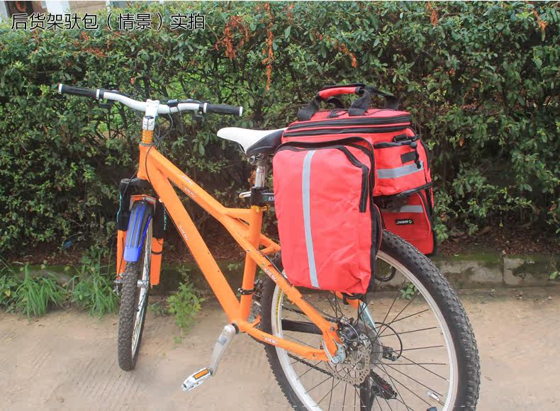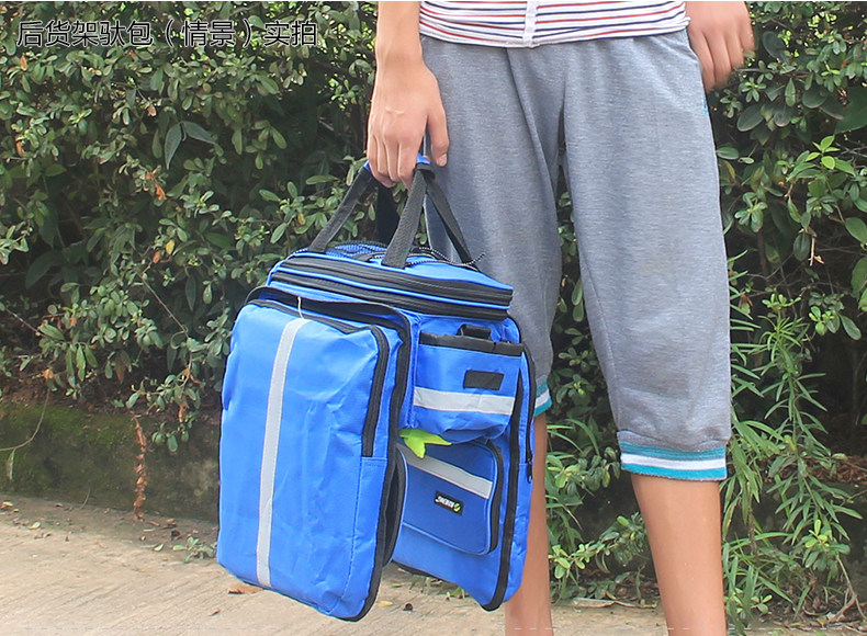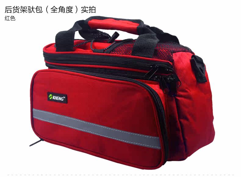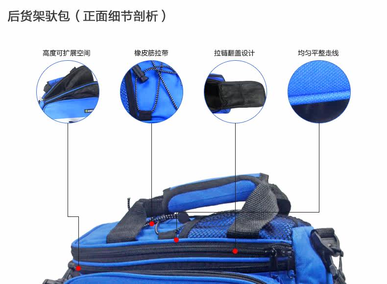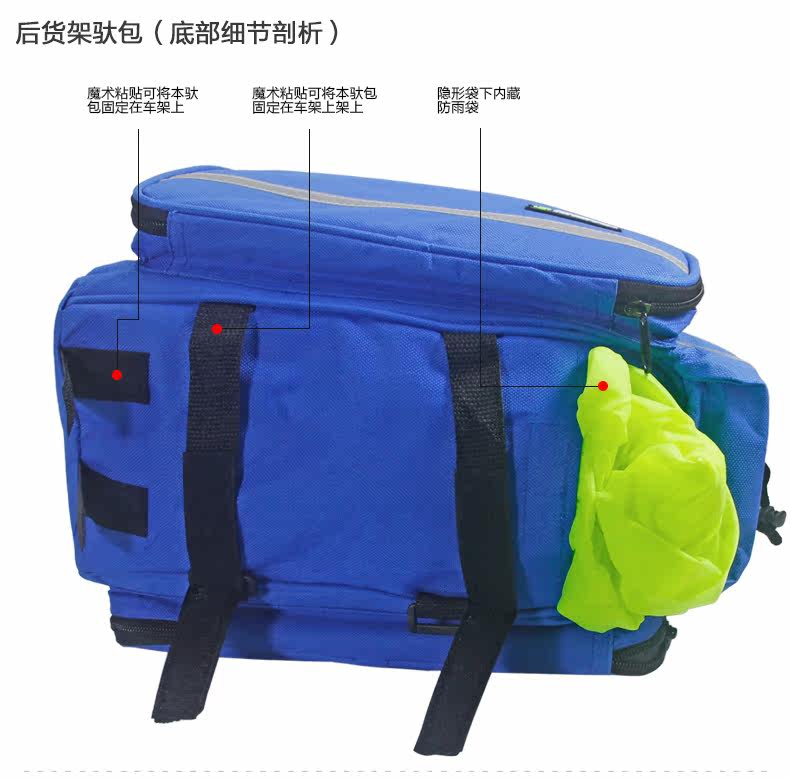 ●驮包展开后形成一个带两侧包的短途旅行车载驮包 ●车包材料本身有很好的防水涂层 ●驮包主体的大包可以用来放一些日常用品 ,因为底部有很厚的垫层 ,可以起到很好的防震效果 ●两侧和后面有反光条 ,能起到很好的低照度下的警示作用 ●后侧:可以放一个标准水壶甚至大可乐 ,后侧有反光条 ,确保夜行也起到警示作用 特点: 1 .安装方便 ,不需要任何工具 2 .方便实用 ,下车拆除后 ,可以作为提包使用 3 .容量够大 ,其实装了很多东西都没把它装满 ,4天内的短途已经足够了 4 .做工设计相当完善 ,有反光条 ,各个方位都能看到