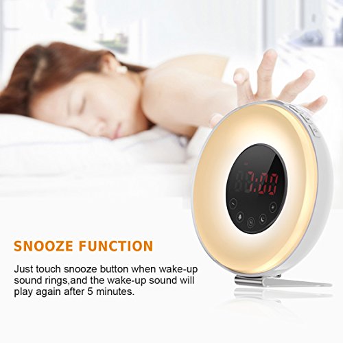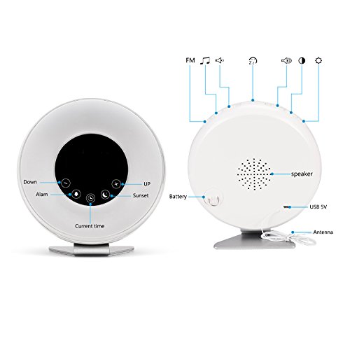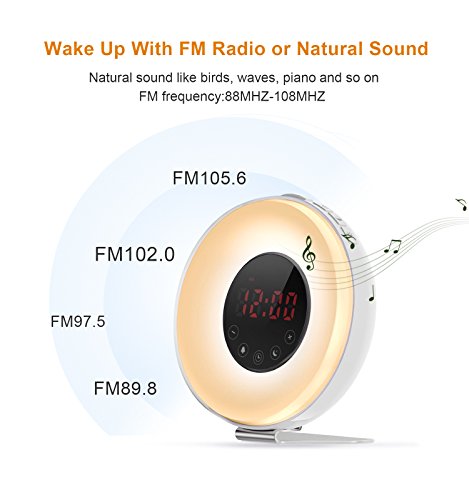 6 NATURAL SOUNDS & FM RADIO - Multiple soft sounds can be chosen for personal preference,such as pure music, birds, forest, waves, beeping and so on, which lets you feel the beauty of nature in the early morning; And FM radio makes you wake up in your favorite radio show.