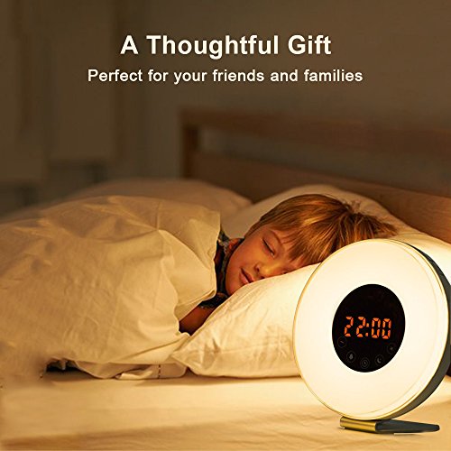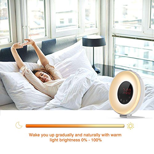 SUNRISE & SUNSET SIMULATION - 30 minutes light up before your alarm time set by gradually getting brighter from 1%-100% in brightness to wake you up just like sunrise. By sleeping time set, it will dim down gently and turn off after 30 minutes just like SUNSET to help you fall asleep naturally.