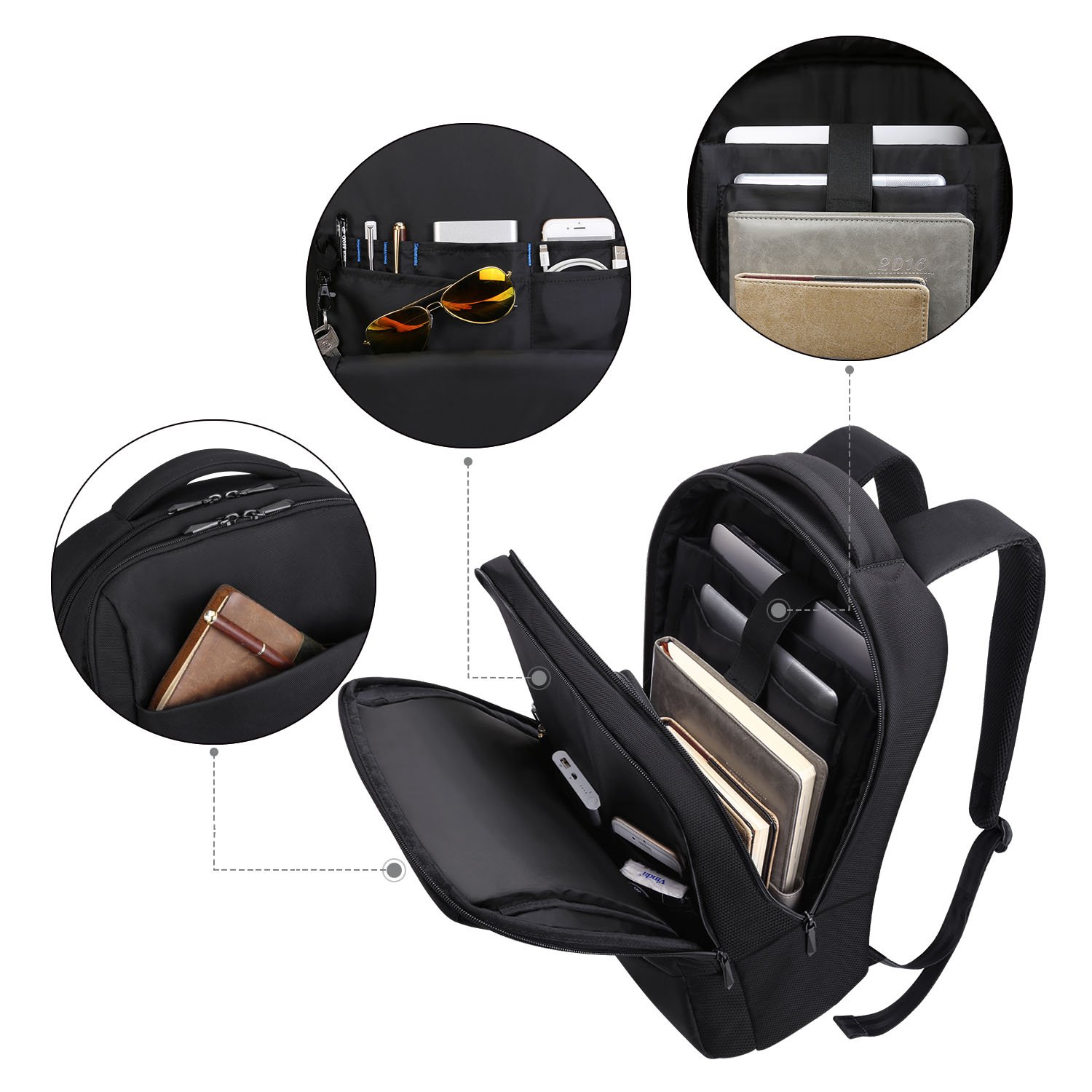 We have personal computers, tablet pockets, key buckles, pen holders, accessories storage space available.