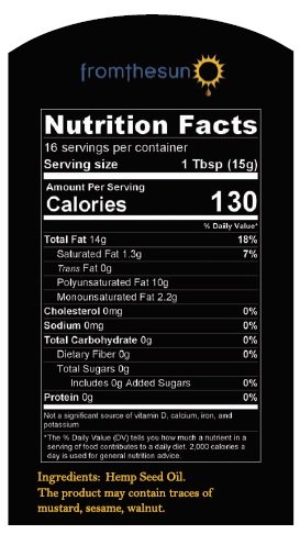 -. Binding : Health and Beauty -. Brand : From The Sun -. Feature : h.e.m.p seed Oil 100% Natural Cold Pressed / Moisturizer / Hair, nail, skin health / Normalizes sleep and may lowers blood sugar level -. IsAdultProduct : 0 -. Label : fromthesun -. LegalDisclaimer : must be at least 18 & over to purchase. The product may contain traces of mustard, sesame, walnut -. Manufacturer : fromthesun -. ProductGroup : Health and Beauty -. ProductTypeName : HEALTH_PERSONAL_CARE -. Publisher : fromthesun -. Studio : fromthesun -. Title : h.e.m.p seed Oil Cold Pressed 100% Natural 8.45 fl oz / 250 ml