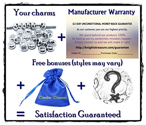- Feature : FREE BONUS charm, gift bag, and manufacturer warranty card with every order, suitable for immediate gift giving, making this A Real Value. / HIGH QUALITY platinum and silver color plated zinc alloy is hypo-allergenic, and nickel, lead & cadmium-free. It is recommended to protect these affordable costume jewelry charms from moisture. / 12 platinum color and 12 silver color for a total of 24 spacers to help your charms stand out and easily change the look of your bracelet or necklace. THESE ARE NOT STOPPERS OR SAFETY CHARMS AND DO NOT HAVE SILICONE RINGS INSIDE. / COMPATIBLE fit with Add a Bead bracelets and necklaces brands like Trollbeads Chamilia Biagi Caprice Hallmark Connections Oriana Lovelinks by Aagard Reflections Individuality Storywheel Novobeads Storyvines DaVinci Soufeel Kays Charmed Memories Ohm SimStars Brighton Zable and Pandora. / 62-DAY UNCONDITIONAL original manufacturer money-back guarantee for Timeline Treasures™, Timeline Trinketts™, and Timeline Traditions™ from The Knights Treasure LLC. Carefully hand selected to insure quality. Unthreaded core size 4.5-5mm.