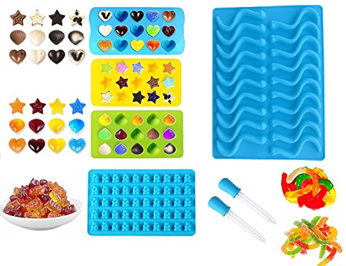 5 Pack Premium Gummy Worms Mold & Bear Mold & Hearts &Stars & Shells Silicone Molds + 2pc Dropper ✮ Make Gummy, Candy ,Jello,Chocolate, Flavored Ice and everything you want! The best quality silicone