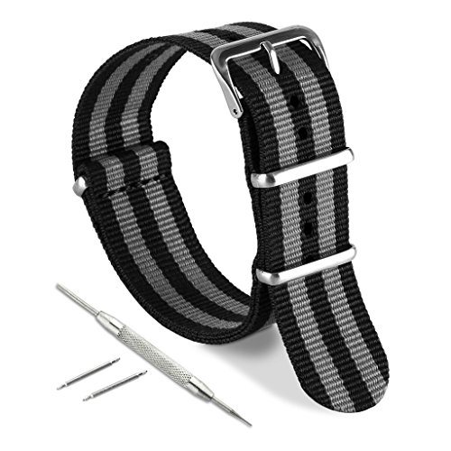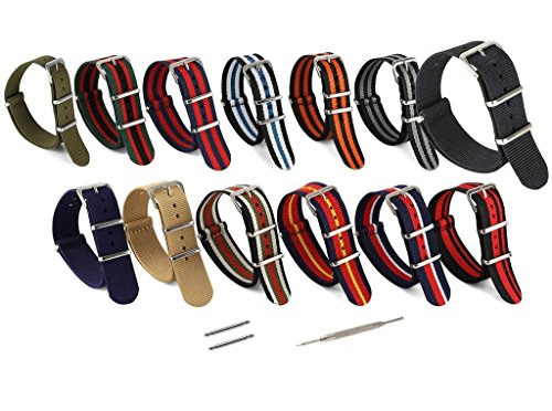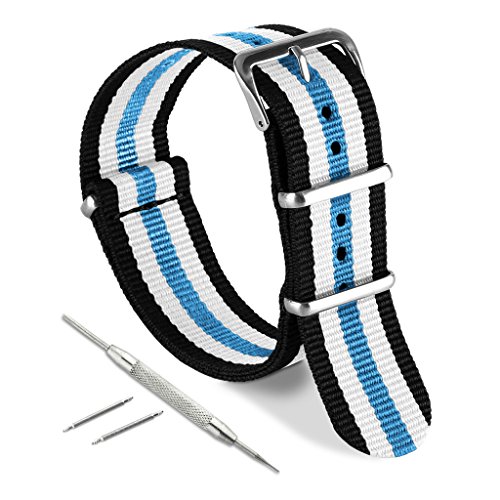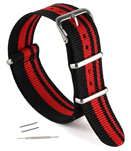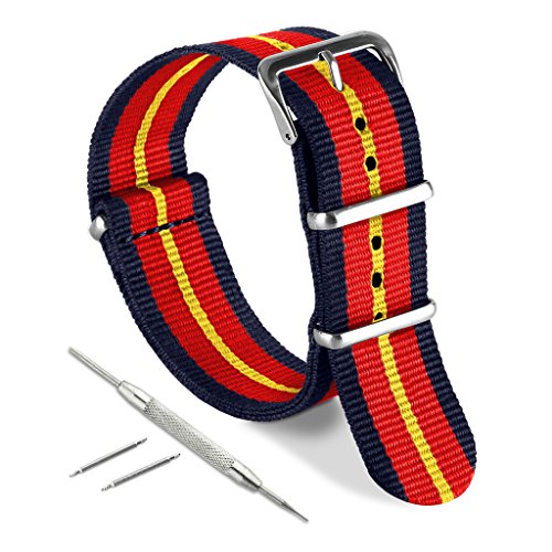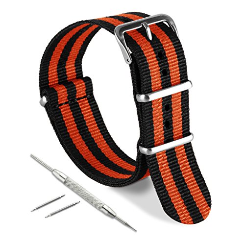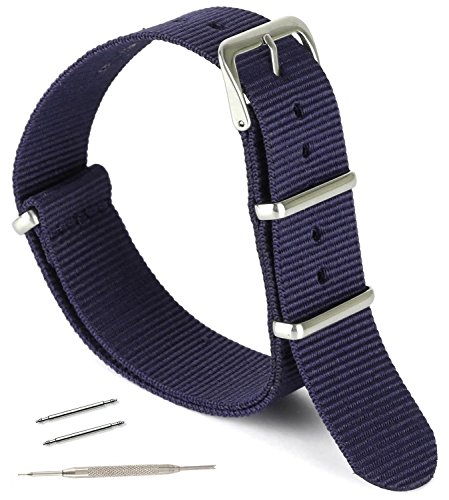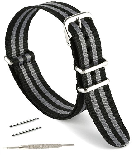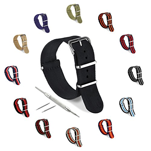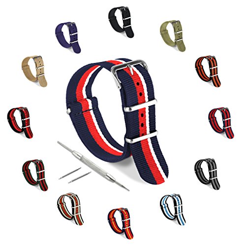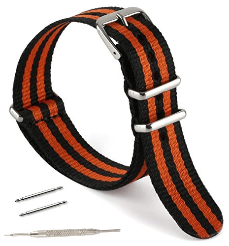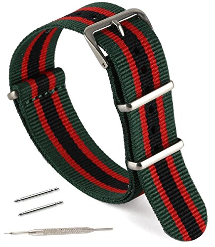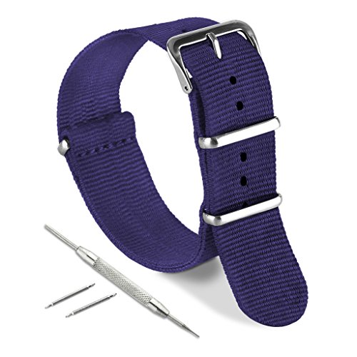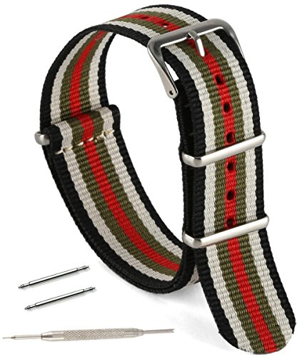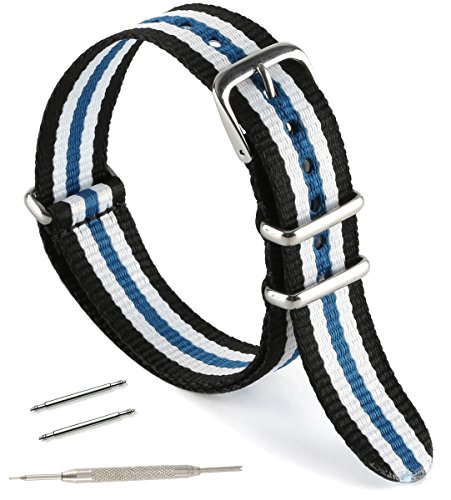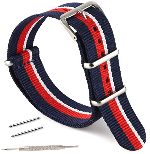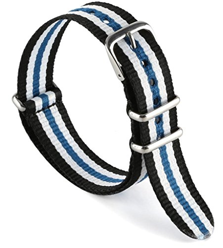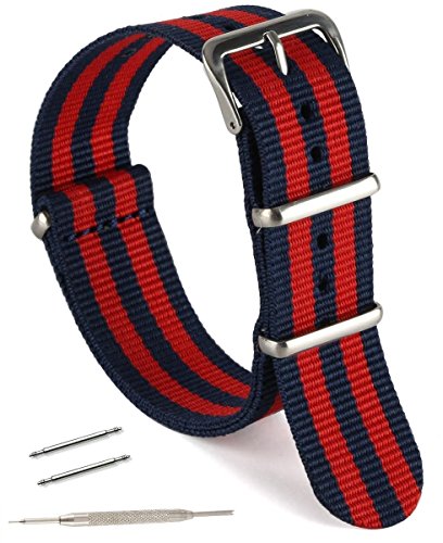 United Watchbands NATO nylon wristbands come in an assortment of exciting colors and styles that are sure to work with your wardrobe and lifestyle! Made from a super strong nylon fabric which withstands changes in temperature and activity, these wristbands are made for long-term use. They are waterproof, and come with the special addition of two stainless steel buckles to secure on your wrist in just the right place. Stainless steel has been used in hospital settings for years for their revered sanitary qualities, and is utilized here as well for the buckle and loops, thus rendering the product to be sweat-proof and have anti-microbial properties. These wristbands can be used with different watch faces and decorative bezels, so that they are effective for any situation, from office meetings to exercise routines. They do not keep odors, or shrink with wear or wash, and are thus guaranteed to remain at their highest quality!