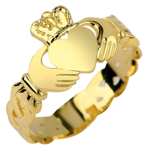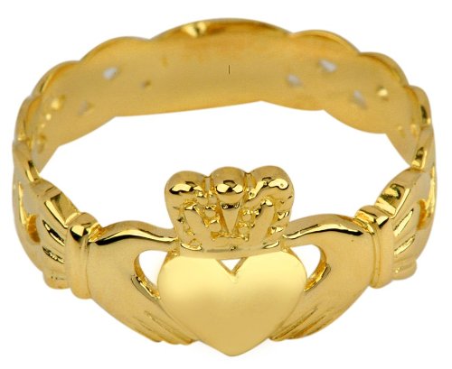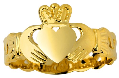 -. Binding : Jewelry -. Brand : Claddagh Rings -. Department : womens -. Feature : dainty Irish Claddagh ring with Celtic Trinity knot band motif crafted exclusively for women / carefully crafted with fine 10 karat yellow gold and perfect polished finish / comes with free special gift packaging / made in the USA yet offered at factory direct jewelry P.R.Ice / ships from the manufacturer directly to the customers -. Label : Claddagh Gold -. Manufacturer : Claddagh Gold -. Model : RGN1019 -. ProductGroup : Jewelry -. ProductTypeName : FINERING -. Publisher : Claddagh Gold -. Studio : Claddagh Gold -. Title : Ladies 10k Gold Claddagh Ring with Trinity Band