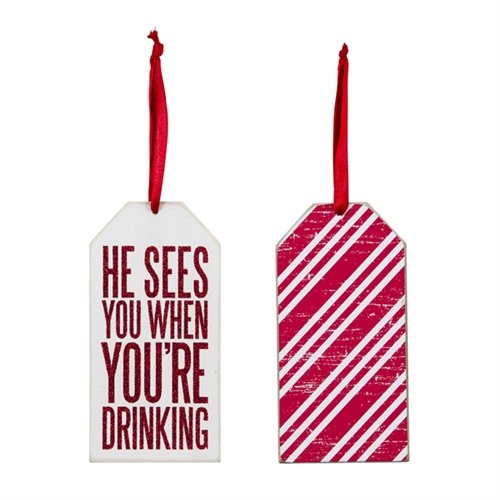 -. Brand : primitives by kathy -. Color : Red / White -. EAN : 0883504237307 -. Feature : Wine Bottle Tag / Red glittered writing / White background / Primitives by Kathy -. ProductGroup : Kitchen -. ProductTypeName : KITCHEN -. Title : Christmas wine/alcohol Christmas bottle tag assorted by Primitives by Kathy (HE SEES YOU WHEN YOU'RE DRINKING) -. UPC : 883504237307