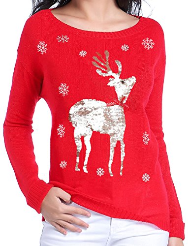 v28 Ugly Christmas Sweater, Women Girls Cute Shining Reindeer Pullover Sweater (L, Red (light-gold Deer))