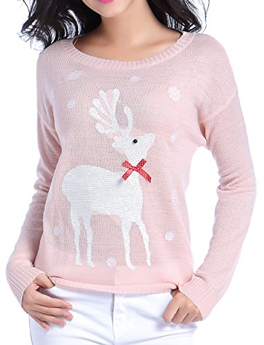 v28 Ugly Christmas Sweater, Women Girls Cute Shining Reindeer Pullover Sweater (M, Pink)