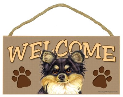 Chihuahua (longhaired, Black & tan) Welcome Sign 5" x 10" MDF Wood Plaque