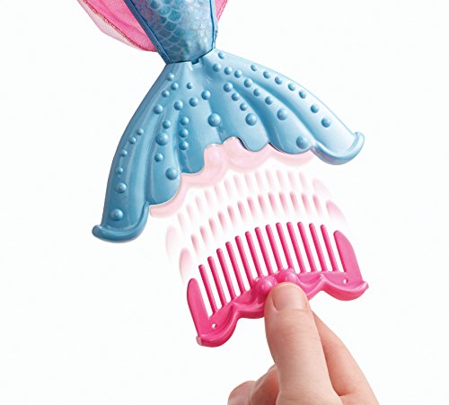 For even more magical fun, use ice cold water to effect color change in her hair. Apply cold water to see pink streaks appear; use warm water to return to blonde. A comb hidden in her fins is perfect for styling her long wavy locks (simply pull comb out and slide back in), and a pink tiara with a seashell design is the perfect mermaid princess touch.