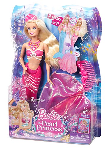 In the new fantastic underwater adventure Barbie and the Pearl Princess, Barbie stars as a beautiful mermaid princess with a magical power over pearls. A kind and creative soul, she uses it to style fabulous hair for her friends and clients at the mermaid salon. On an exciting journey to the Mermaid Kingdom, she experiences a dramatic transformation into a true princess when she attends the royal ball under the sea. Barbie and The Pearl Princess 2-in-1 Mermaid doll celebrates her transformation from a mermaid hairstylist to a mermaid princess (who still likes to style hair!).
