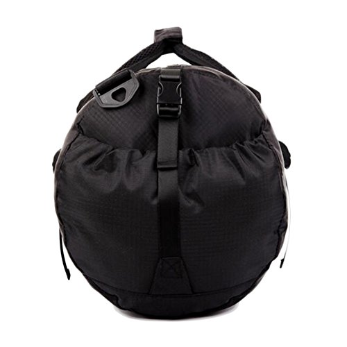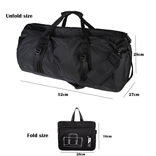 -. Feature : Product dimensions: Unfold size 52cm x 28cm x 27cm(Length x Width x Height). Fold size: 20cm x 16cm x 3cm. / The main material is made of high quality Oxford fabric. / Foldable: This bag can fold from original size down a small carrying pouch, collapsible for easy storage, very convenient when traveling. / Waterproof: Specially coated with a waterproof layer on the inside layer, keep your stuff dry and safe when encountering rainy day occasionally. / Large Capacity: The capacity of this travel duffle bag with multiple pockets is about 50 liters, which is ideal to use it as a gym and sports bag to carry all your gear as well as a travel bag to carry all your travel necessities. Moreover, this large duffel bag also can be used as a dirty laundry compartment at home
