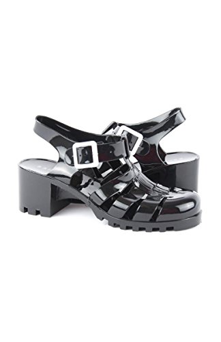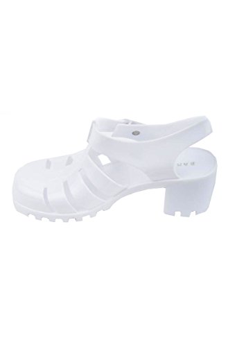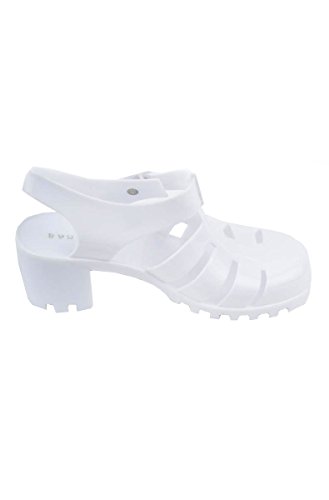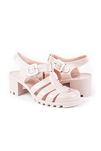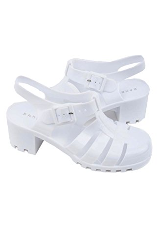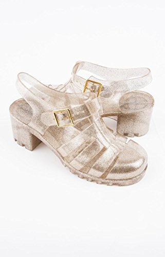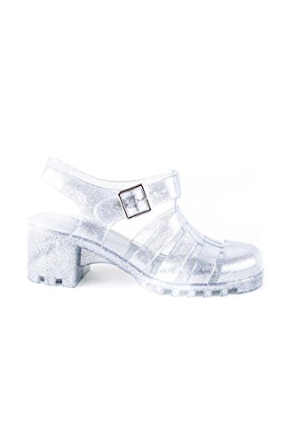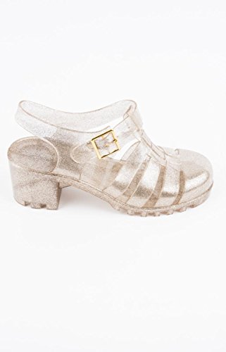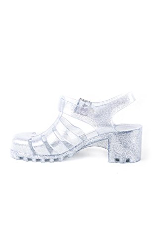 Product DescriptionFeaturing glitter jelly throughout, strappy cage design, round toe, lug sole, chunky heel, open back, and ankle strap with adjustable buckle closure. Material: PVC (man-made) Sole: PVC Measurement Heel Height: 2.25" (approx)0