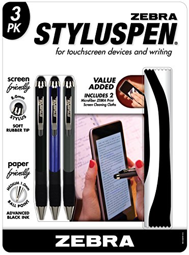 Zebra Pen Stylus Pen Retractable Ballpoint Pen with Microfiber, Basic Colors, 3 Pack (10466)