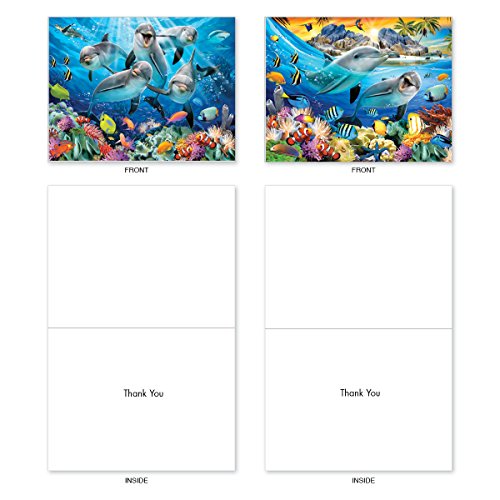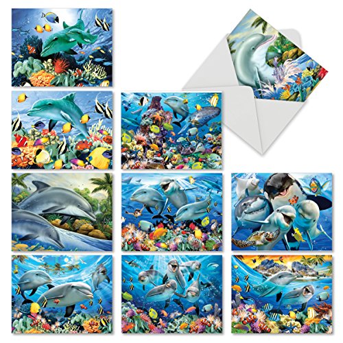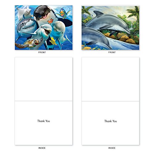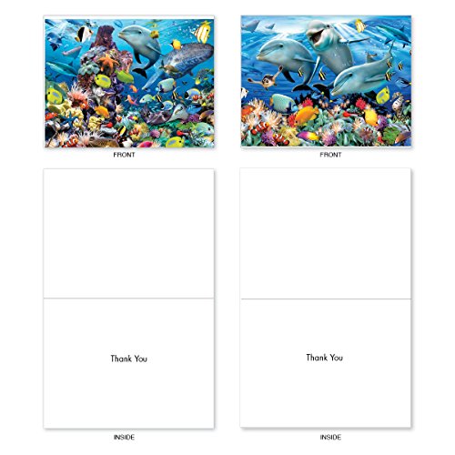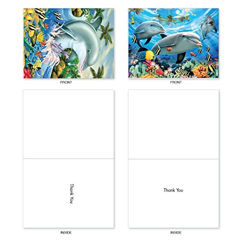 M6643TYG Multi Porpoises: 10 Assorted Thank You Note Cards Featuring Frolicking Dolphins with Other Underwater Sea Creature Friends, w/White Envelopes.