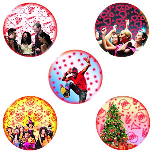 -. Feature : 5 - all occasion icons built-into the FX lens: Starburst, party, hearts, Halloween and Christmas / Built-in speaker connects to smartphone, tablet or laptop / 2 speeds of rotation and 7 speeds of strobe effects / USB connector and audio cable included / Decorate for every occasion - no mess, nothing to hang