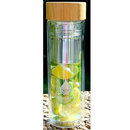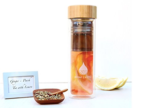 This brand new Define Bottle Bamboo features a removable tea strainer and below a place for your own added fruit, ice or herbs to create your own signature blend, This bottle is BPA free & chemical free.