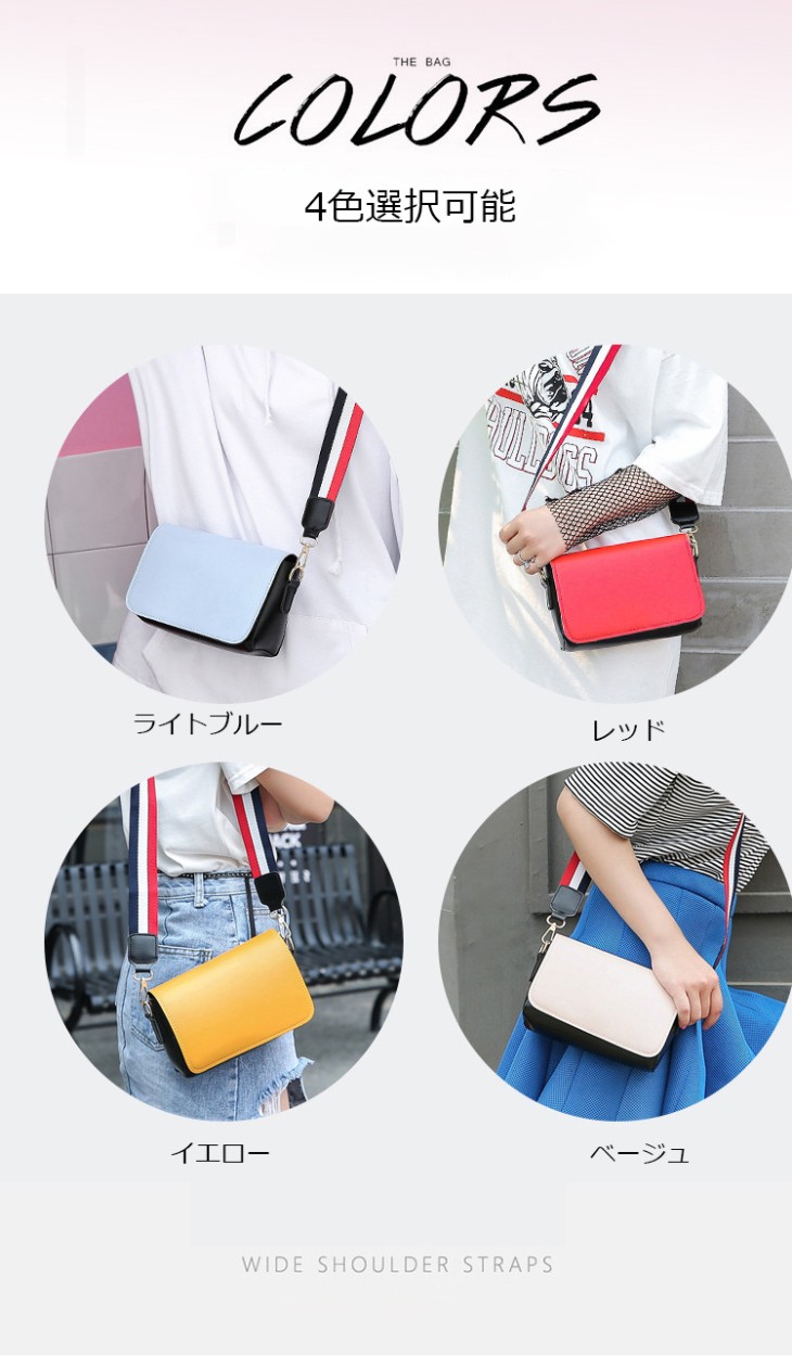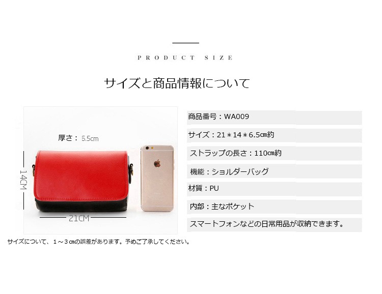 商品番号:WA009商品説明:◆伸縮性:有り◆厚さ:普通◆素材:PU、ポリエステル、金属◆バッグのサイズ:長さ:21cm約 高さ:14cm約 厚さ:6.5cm約 ストラップの長さ:110cm(スマートフォンや他のキーなどの小さい物が入れます。)◆色:イエロー、レッド、ライトブルー、ベージュ◆重量:200g約◆商品内容:1xバッグ特徴:【軽くて、携帯便利】小さいサイズなので、軽くて、携帯便利です。出かける時に最適!!コンパクトサイズのショルダーバッグ。内ポケット付きです。【ファッションなデザイン】欧米風なファッションのバッグなので、学生にも人気があります。使い勝手が良いサイズなので、毎日の通勤通学にピッタリ☆【多彩な色】四種類な色を選択可能です。簡単的にファッションなデザインのカバンです。おすすめです。