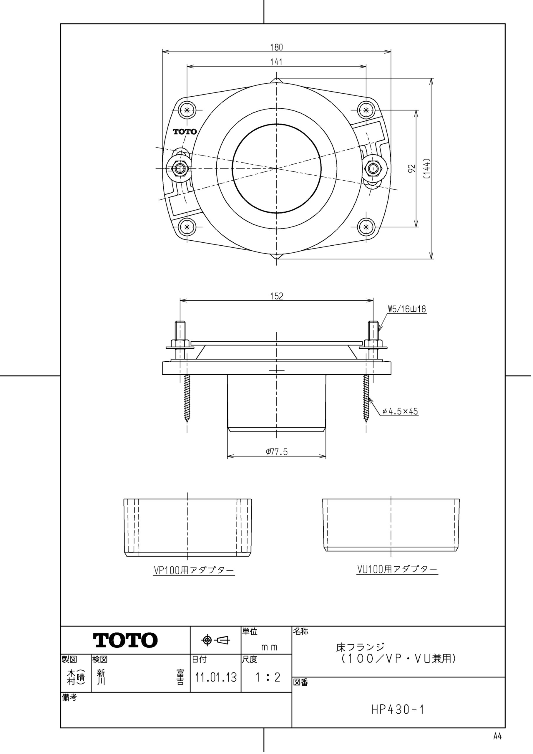 TOTO floor flange VU ・ VP100 for HP4301