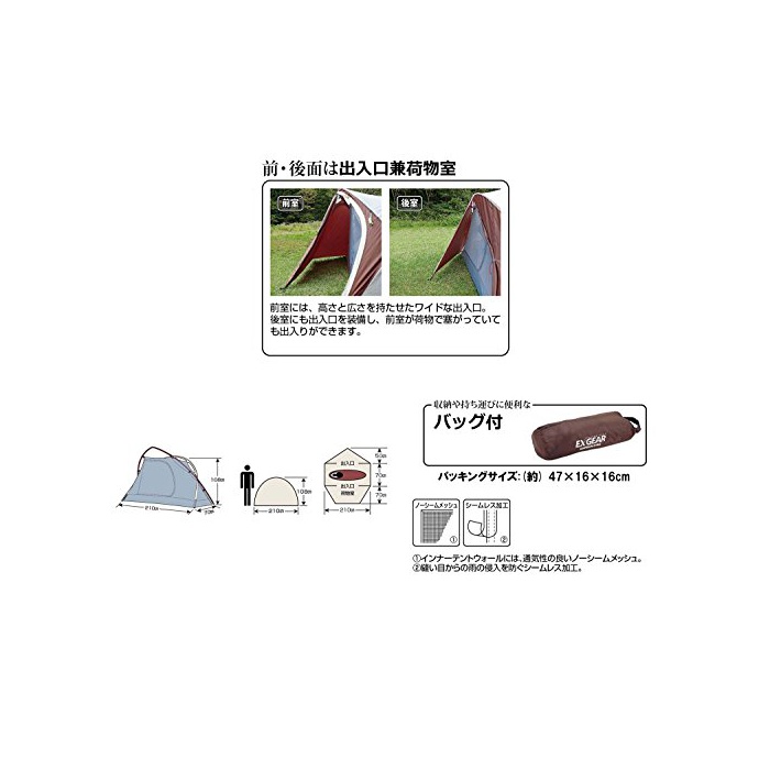 ●사이즈:플라이(약)/210×190×H130cm,이너(약)/210×70×H108cm●중량(약):2.2kg●재질:플라이/폴리에스텔185T(PU2000mm)고, 이너/wall=폴리에스텔 노 seam 메쉬,플로어=폴리에스텔OXF150D(PU3000mm)고, 폴/알루미늄 합금 직경8.5mm●팩킹 사이즈(약):47×16×16cm