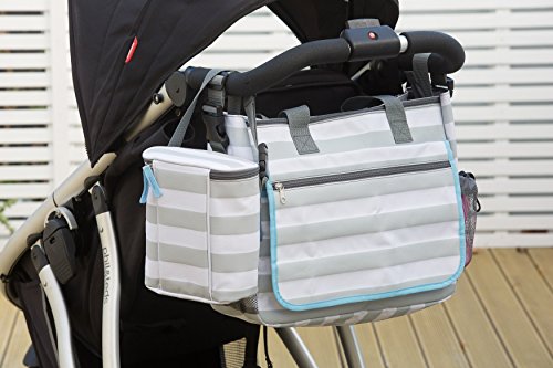 The adjustable strap allows the bag to easily attach to a stroller. The two way zips make opening and closing simple and the easy wipe interior means cleaning is a breeze. When not in use the bag folds flat and can be tucked out of the way.
