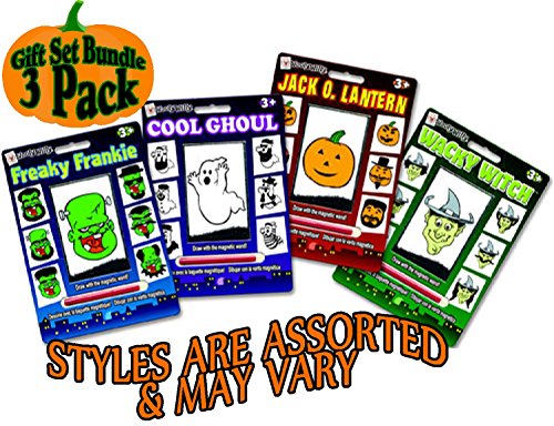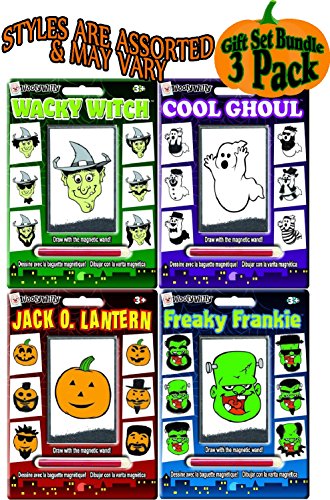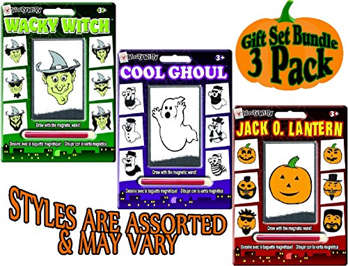 Wooly Willy Magnetic Personalities Halloween Gift Set Party Bundle - 3 Pack (Assorted), is AWESOME! Set Includes Wacky Witch, Cool Ghoul and either Freaky Frankie or Jack O. Lantern! Use the magnetic wand to draw hair, whiskers, a mustache, or any creative face. Have hours and hours of endless, creative play with Wooly Willy. These self-contained packages make them easy take anywhere! Makes a great gift & is perfect for Halloween, schools, party favors, stocking stuffers, travel, baskets, special needs and so much more! For Ages 3 and up - Fun for the whole family! - Each board measures 7" x 5" & includes a magnetic wand.Feature
