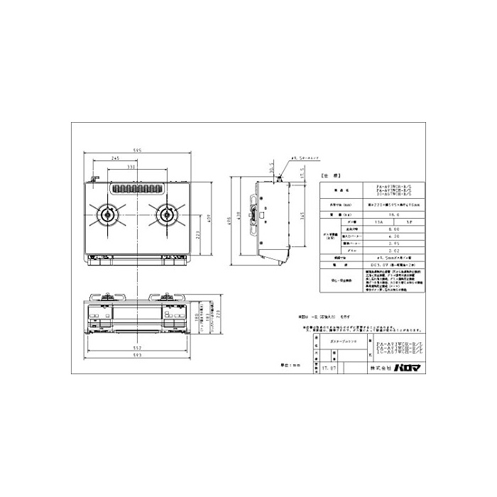 원본상품명: パロマ ガステブル 左火力(59cm)(都市ガス用) ※ガスホス別 都市ガス用 PA-A93WCR-L-13A