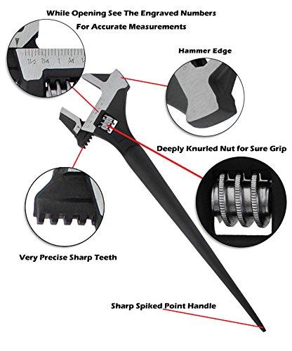 ✓ DESIGN: The Spike Handle is a straight continuous taper all the way up until it transitions into an adjustable wrench for bolt alignment with a hammer edge - Perfectly perpendicular and smooth Jaws - Knurled Wheel turns smoothly for easy operation.