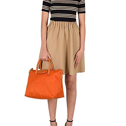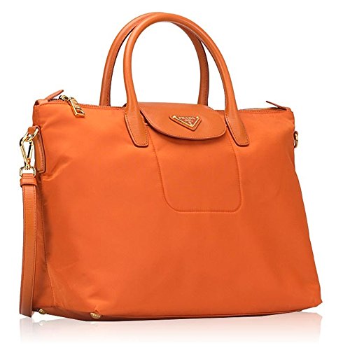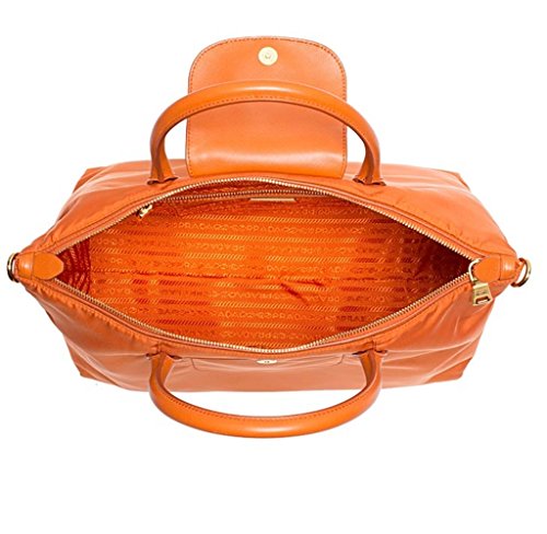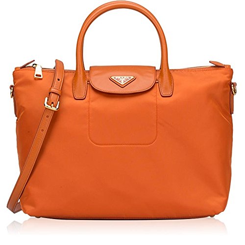 Product Description Prada style number BN2541 Made of beautiful nylon and Saffiano leather trims. Double leather handles on top with a 19" to 23" adjustable cross body detachable leather strap. Gold-tone hardware and logo on the flap. Zip top and magnetic flap over closure with a small reach in pocket under flap. Fabric script logo interior lining with one large zip pocket and one reach in pocket. Metal protective feet on the bottom with PRADA engraved. Casual and stylish bag for every day use. Dust bag, care card, tag and certificate of authenticity included Color: Papaya Dimensions: 15"(L), 10"(H), 7"(W) Made in Italy 0