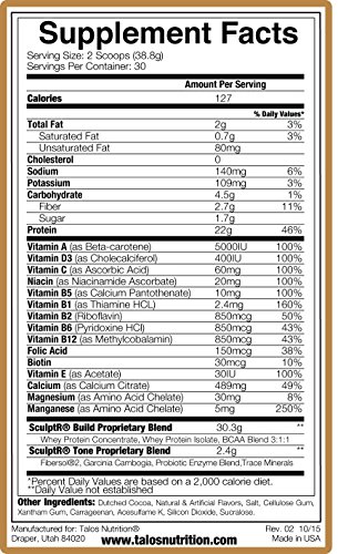 -. Binding : Health and Beauty -. EAN : 0689043019028 -. Feature : Banned Substance Free / Protein mix of high-grade Whey Isolate and BCAA's. / Includes trace minerals, digestive enzymes, and probiotics. / To maintain and increase lean muscle mass / Loaded with B Vitamins for energy production and cell metabolism. -. IsAdultProduct : 0 -. Label : Pharmatech -. Manufacturer : Pharmatech -. MPN : TN61697 -. PackageQuantity : 1 -. PartNumber : TN61697 -. ProductGroup : Health and Beauty -. ProductTypeName : HEALTH_PERSONAL_CARE -. Publisher : Pharmatech -. Studio : Pharmatech -. Title : Talos Nutrition SculptR Chocolate Protein Powder Ð 2.55lbs Ð 30 Servings Ð 30g Protein in one serving including 5g BCAA's.Probiotics and Digestive Enzymes included! -. UPC : 689043019028
