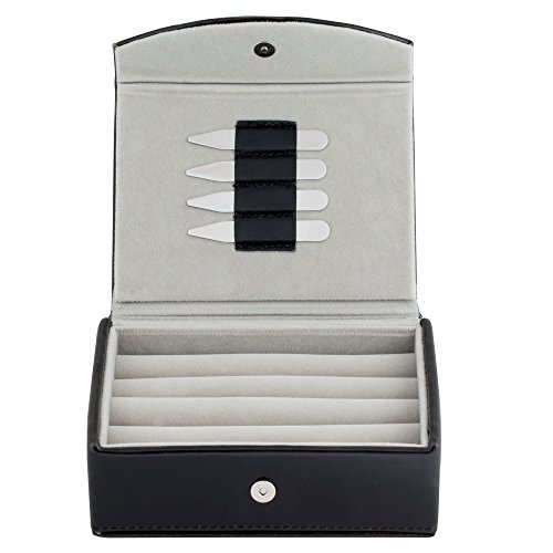 Studio : Cuff-Daddy Publisher : Cuff-Daddy Binding : Jewelry Product Description You can't find a better travel cufflinks box anywhere, trust me we would know. This box holds up to 12 pairs and presents them for easy review with the rollers. This box also holds men's rings too. The best part is there are 2 free pairs of highly polished 2 1/2" metal collar stays strapped to the underside of the lid. A brilliant design that has you looking your best on the road. The free collar stays are the perfect size for 90% of the collars on the market. The leather is PU leather, which is a material made with a split leather backing covered with a layer of polyurethane (hence the term "PU leather") that is applied to the surface. Pick yours up while supplies last. Arrives in a white cardboard box for easy wrapping. 0