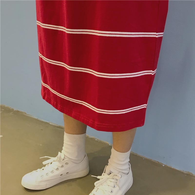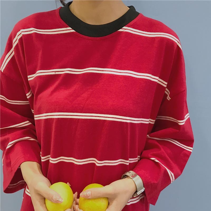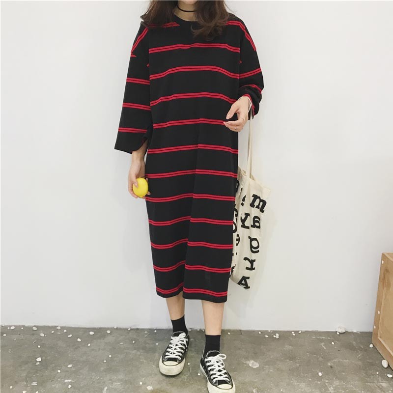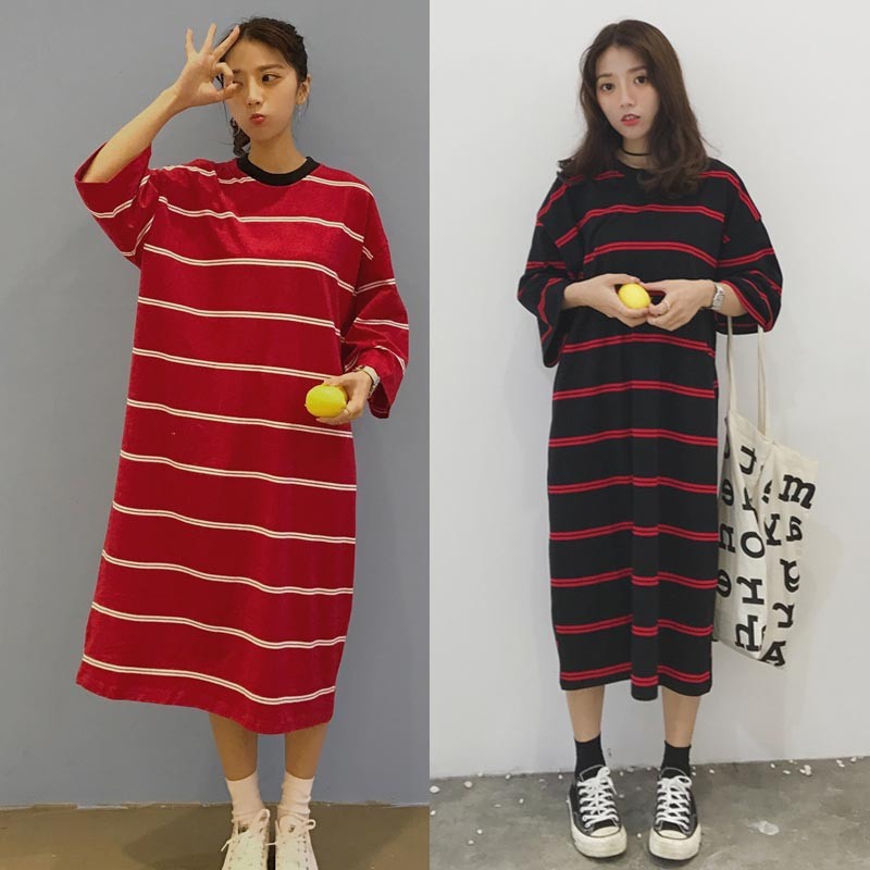 ラウンドネックで7分袖ボーダー柄のストンとしたロング丈のワンピース♪