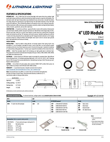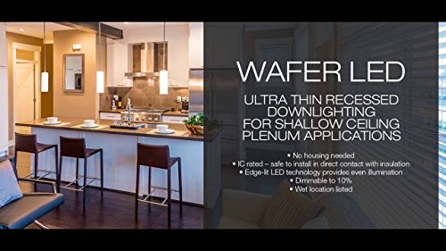 The 6 pack of Lithonia Lighting Wafer-Thin LED recessed downlights with remote driver box combines high quality light output and efficiency while eliminating the pot light housing for competitive affordability. This innovative wafer slim Type IC design allows easy installation for new construction or remodel from below the ceiling without the requirement of a pot light housing. Technical Specifications: Power: 9.6W Input Voltage: 120V (Connects directly to power supply via provided UL recognized driver) Luminous Flux: 675LM Emitting Color: 3000K(Bright White) Dimmable: Yes Light Source: LED CRI: 80 Surface Size: 4.7 inches Back Hole Size: 4 inches Dimension: 4.7 x 4.7 x 1.1 inches Light direction: Downlight Average life: 36,000 hours Warranty: 5 years - Limited Electrical: Plenum rated cable connector to connect from module to remote driver box. Isolated driver integrated inside steel remote box with four 7/8" knockouts with slots for pry-out Meets Highest Industry Standards: CSA certified in the USA and Canada, Energy Star Rated, IC Rated, Wet Listed and Air TightFeature